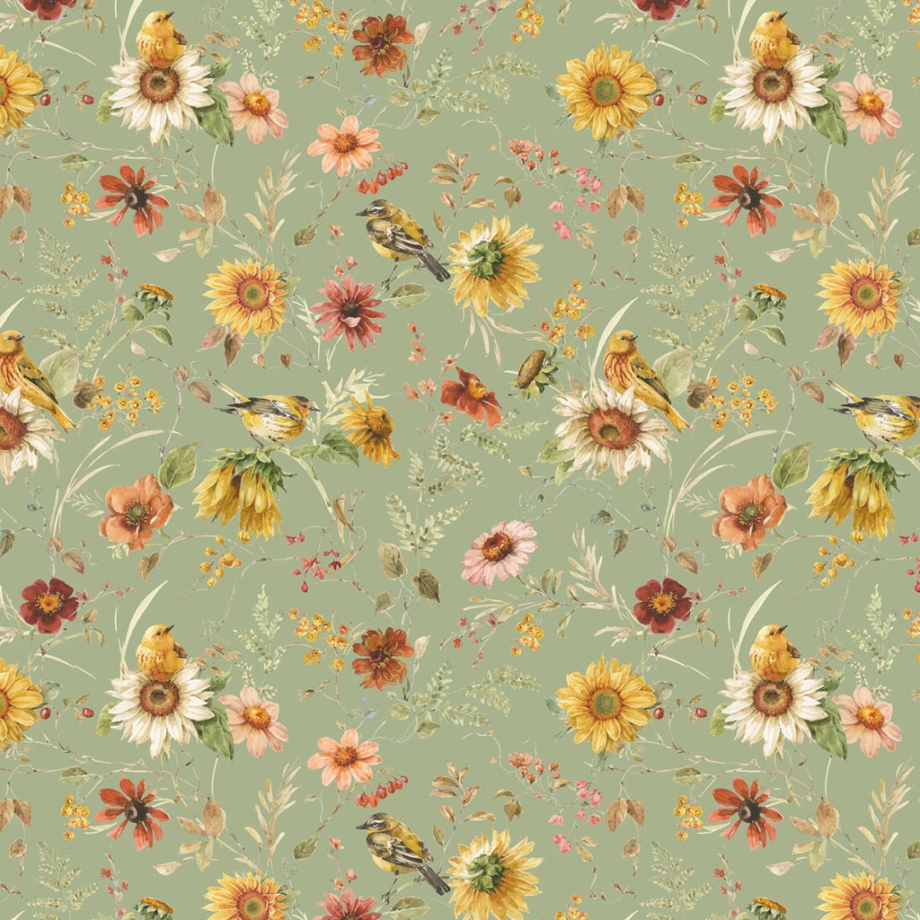 Charming floral and bird print, with sunflowers, daisies, and delicate birds on a soft green background. The design brings a peaceful, vintage garden feel to any project.