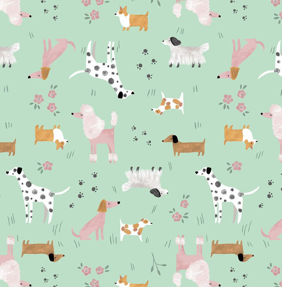 This charming fabric features a delightful array of illustrated dogs in various playful poses, set against a soft mint green background. The design is adorned with small pink roses and scattered paw prints, creating a whimsical and pet-friendly theme perfect for a variety of crafting projects. The dogs, depicted in shades of white, pink, brown, and orange, add a touch of fun and personality to any fabric project.