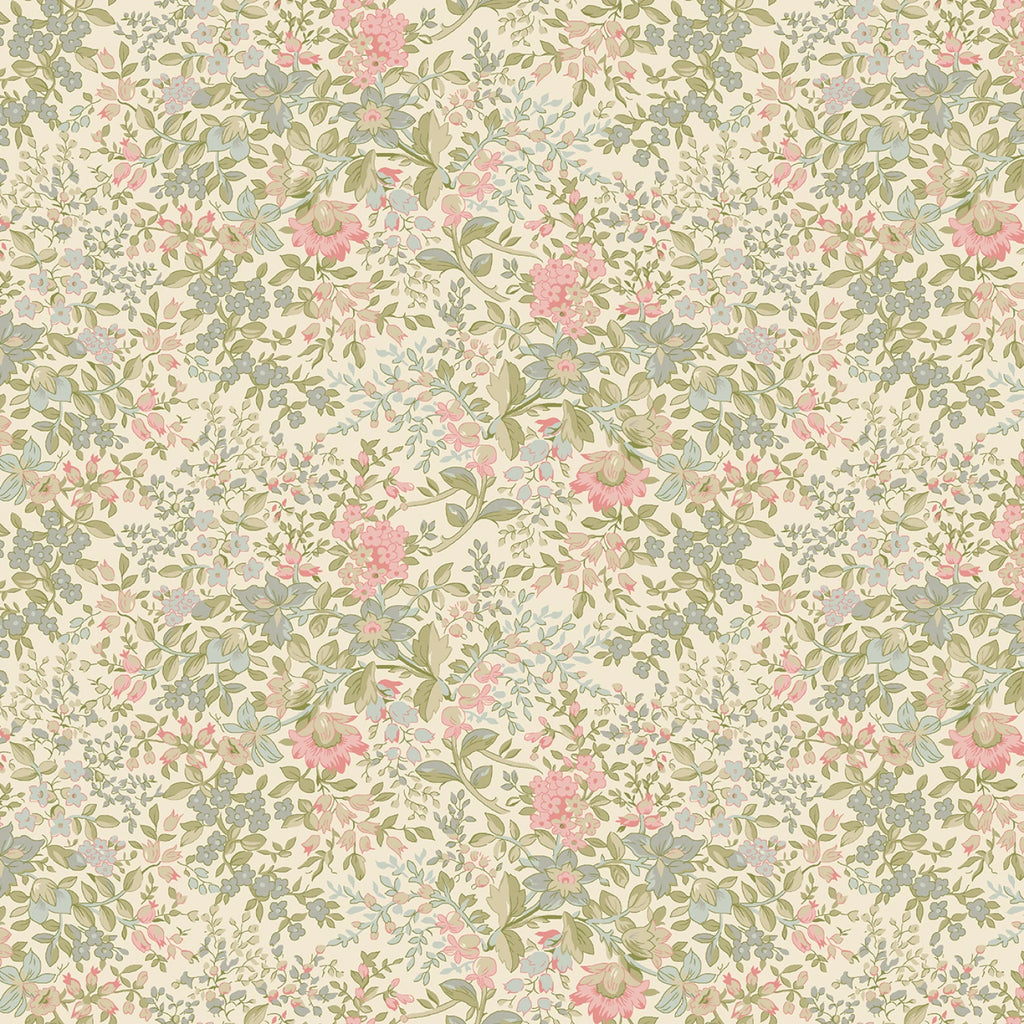 This fabric features a delicate and charming floral pattern with a variety of flowers in soft pastel shades of pink, blue, and green, set against a light beige background. The design is intricate, with small clusters of flowers and leaves spread evenly across the fabric, creating a serene and vintage-inspired look. Ideal for quilting, crafting, or home decor projects, this fabric's wide width makes it particularly suitable for backings or large-scale projects.