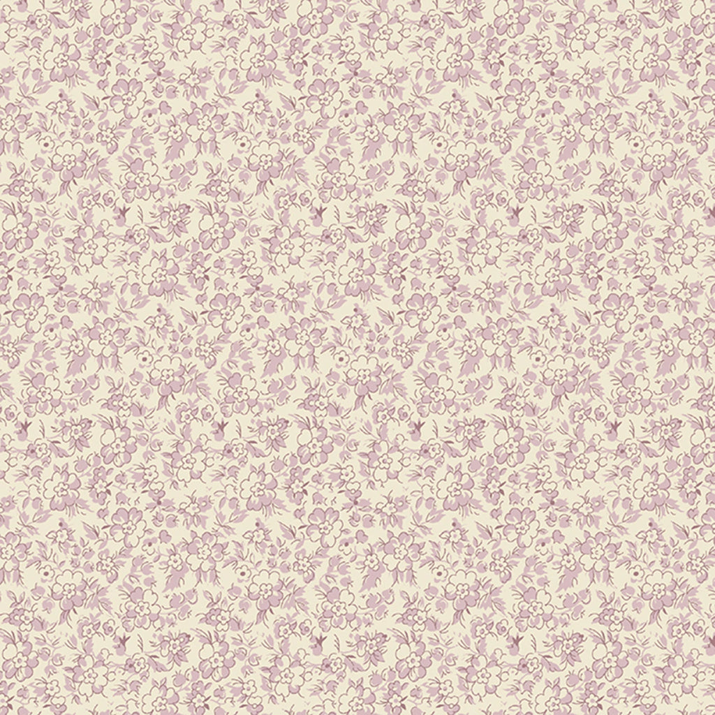 This fabric features a delicate and charming design with small floral and fruit motifs in soft shades of rose and natural tones, creating a vintage calico look that adds a touch of nostalgia to any project. The pattern is evenly distributed across the fabric, providing a consistent and pleasing aesthetic suitable for quilting, apparel, or home decor.
