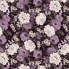 This fabric showcases a rich tapestry of floral elegance, featuring a dense arrangement of roses in shades of purple, lavender, and white, set against a dark background. The design captures the intricate details of each petal and leaf, creating a luxurious and sophisticated look that is perfect for a variety of crafting and fashion projects. The floral pattern provides a classic yet vibrant aesthetic, making it an ideal choice for both traditional and contemporary designs.