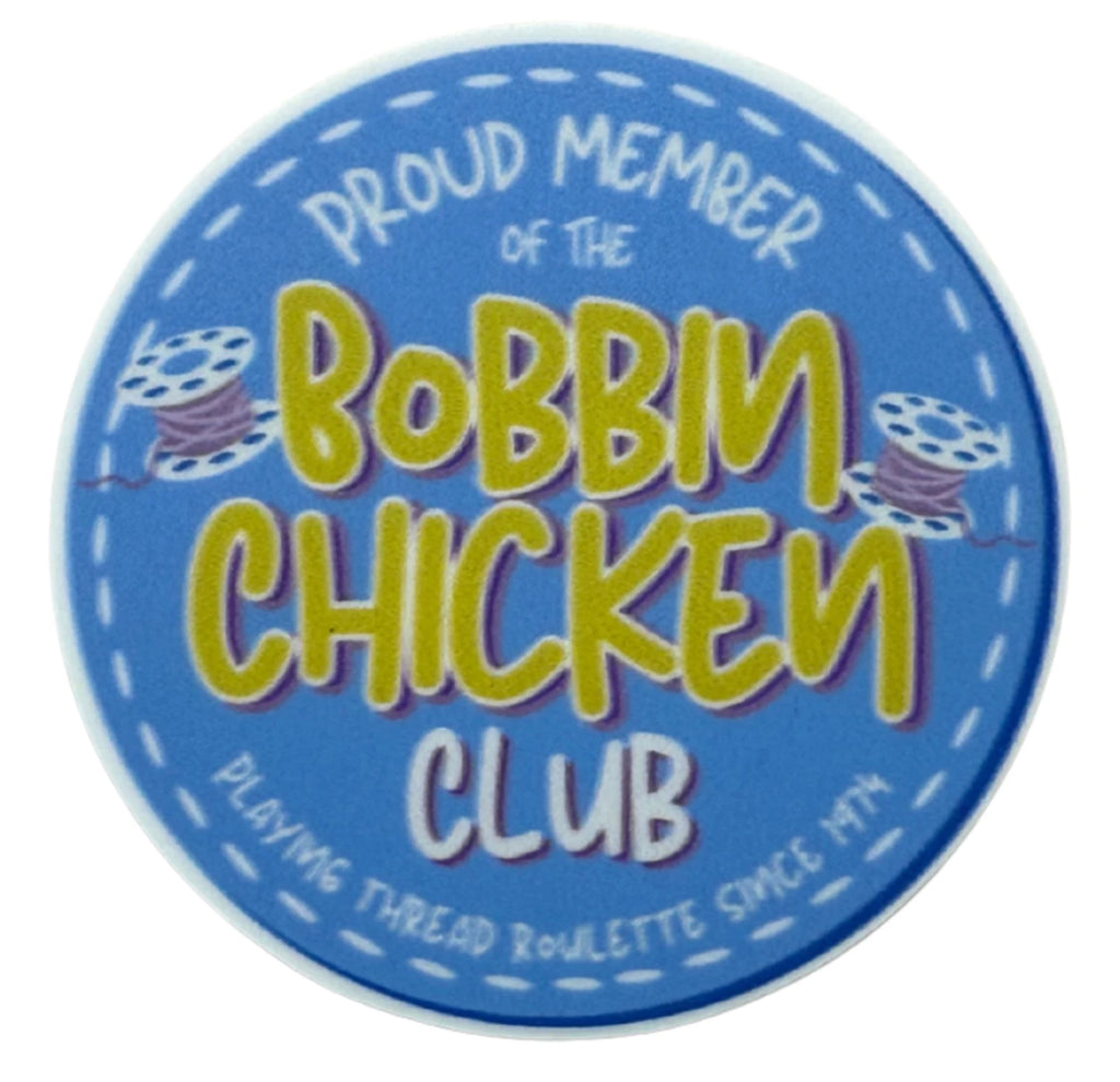 Proudly declare your membership in the Bobbin Chicken Club, because we’ve all played thread roulette a time or two. Bright, cheeky, and perfect for your sewing machine, water bottle, or laptop. Durable and ready to make fellow sewists smile!