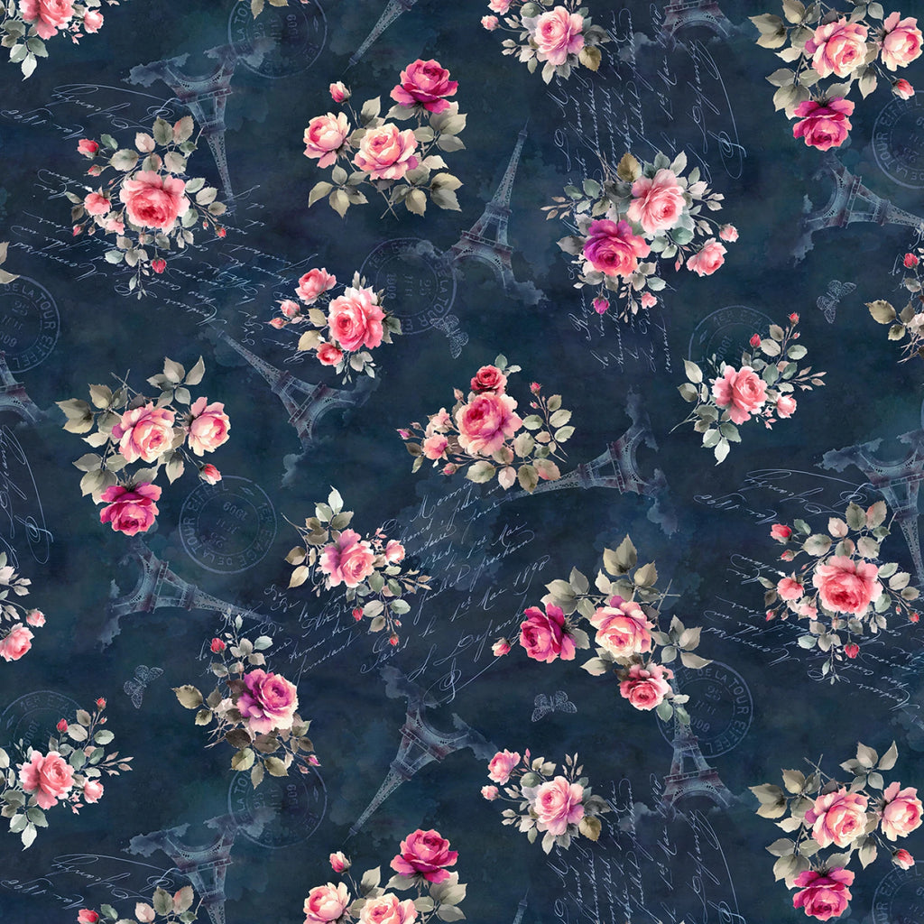Immerse yourself in the romantic allure of Parisian elegance with this deep blue cotton fabric featuring a captivating print of blooming pink roses intertwined with iconic Eiffel Tower silhouettes and delicate French script. The soft woven texture of 100% cotton ensures versatility for crafting heirloom quilts, stylish upholstery, or chic apparel that evokes the charm of a stroll along the Seine. Vibrant floral motifs in soft pinks contrast beautifully against the rich navy backdrop, creating a timeless pattern perfect for adding a touch of sophistication to home decor projects or custom sewing endeavors. Whether you're designing curtains that whisper of French bistros or pillows that capture the essence of spring in Paris, this fabric's intricate design and durable quality make it an essential choice for creators seeking both beauty and functionality.