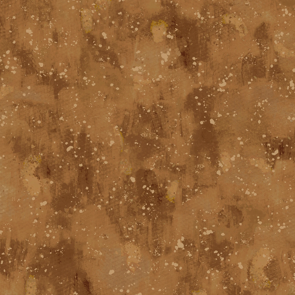 This fabric features a rich, earthy brown base with a brushy, textured design that mimics the cosmos, giving it a unique, artistic flair. The pattern consists of various shades of brown, interspersed with lighter speckles and splatters, creating a dynamic, painterly effect that is both modern and timeless, suitable for a variety of crafting and apparel projects.