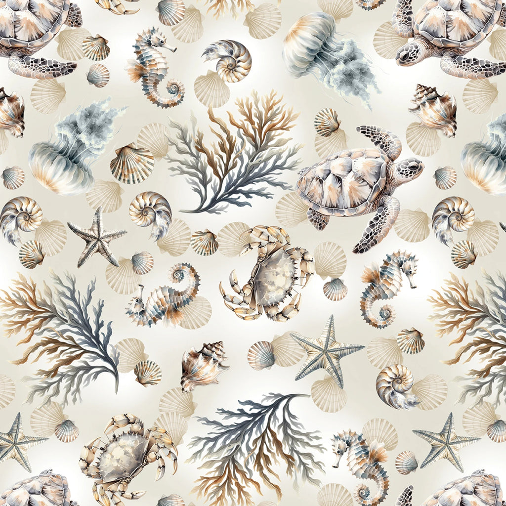 Dive into a serene underwater world with this enchanting neutral marine life print, featuring delicate watercolor-style illustrations of graceful sea turtles gliding alongside whimsical seahorses, intricate seashells, ethereal jellyfish, playful crabs, starfish, and swaying seaweed. Rendered in soft, earthy tones of beige, gray, and subtle blues against a light backdrop, this fabric evokes the tranquil beauty of the ocean floor, making it an ideal choice for upholstery that brings coastal elegance to living spaces or for crafting heirloom quilts, pillows, and apparel that capture nautical charm. Crafted from premium 100% cotton, it offers a gentle drape and breathable comfort, perfect for both bold decorative projects and subtle accents in home decor. Its versatile neutral palette ensures seamless integration into any design scheme, while the detailed motifs add a touch of natural wonder to inspire creativity in sewing enthusiasts and interior designers alike.