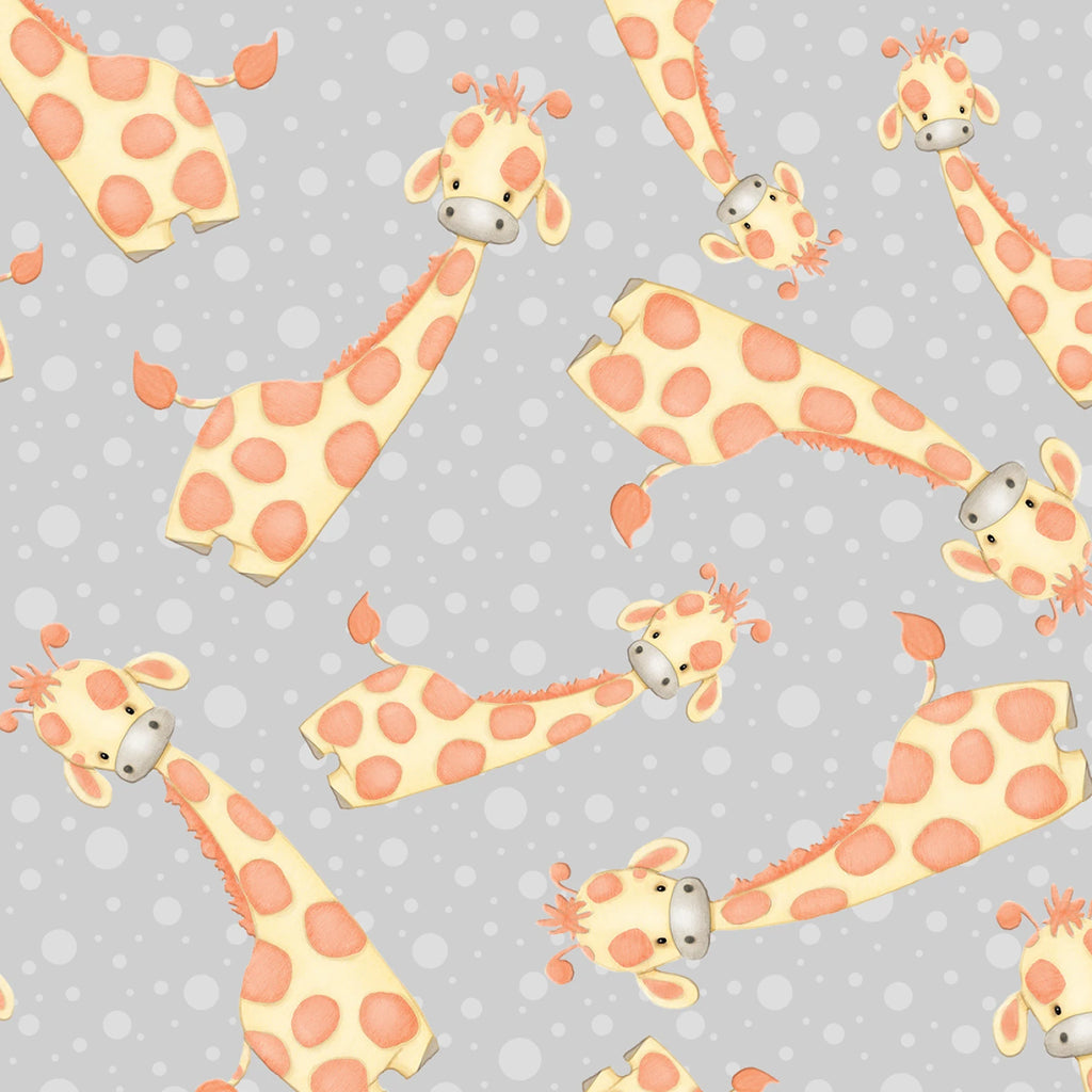This charming fabric features a delightful pattern of playful giraffes in soft peach and orange hues, set against a calming light gray background dotted with subtle white polka dots. The design is both whimsical and soothing, making it perfect for creating cozy flannel garments or home decor items that appeal to both children and adults. Crafted from 100% cotton flannel, this fabric promises comfort and warmth, ideal for crafting baby blankets, pajamas, or soft toys.