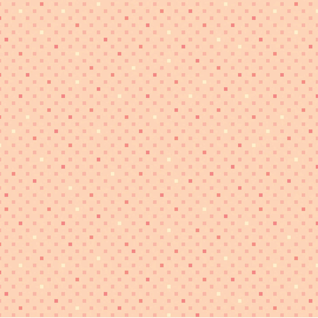 This fabric features a delightful pattern of small squares in varying shades of peach and cream, arranged in a scattered, slightly diagonal layout. The light peach background provides a soft, warm tone, making it an excellent choice for projects that require a gentle yet vibrant touch. Ideal for quilting, crafting, or apparel, this fabric's design brings a modern yet timeless aesthetic to any creation.