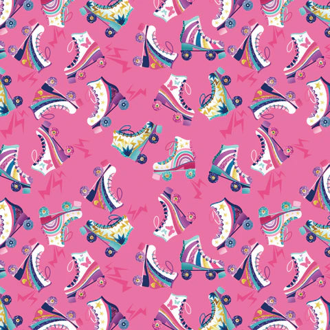 Disco Queen Collection-Let's Roll-Pink . Step aside, it's 'Disco Queen's time to shine! Created in collaboration with Courtney Morgenstern, this vibrant quilting cotton fabric collection is bursting with color and fun elements like roller skates, rainbows, mirror balls and butterflies. Groove along as you make adorable apparel, delightful decor