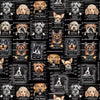 This fabric showcases a playful and engaging design featuring various dog breeds in a humorous 'wanted' poster style. Each dog is depicted with a unique expression and a fun title like 'Treat Thief' or 'Wanted', set against a classic black background with height measurements, reminiscent of an old-school mugshot backdrop. The vivid colors and detailed illustrations make this fabric perfect for projects that need a touch of whimsy and character, appealing to both dog lovers and those who appreciate quirky designs.