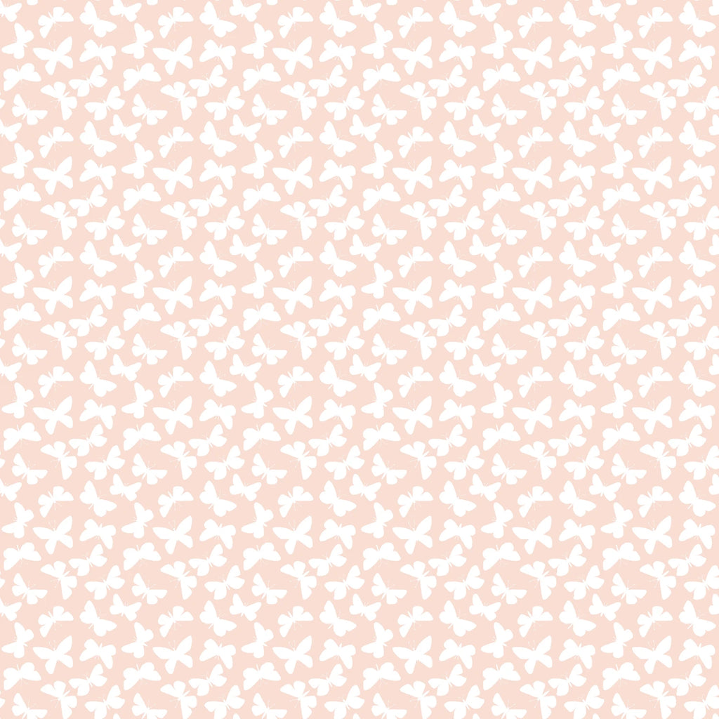 This fabric features a delicate and charming design of white butterflies scattered across a soft blush pink background, creating a whimsical and airy feel perfect for a variety of sewing projects. The pattern's simplicity and elegance make it ideal for crafting items like baby clothes, light summer dresses, or home decor accents, adding a touch of nature-inspired beauty to any creation.