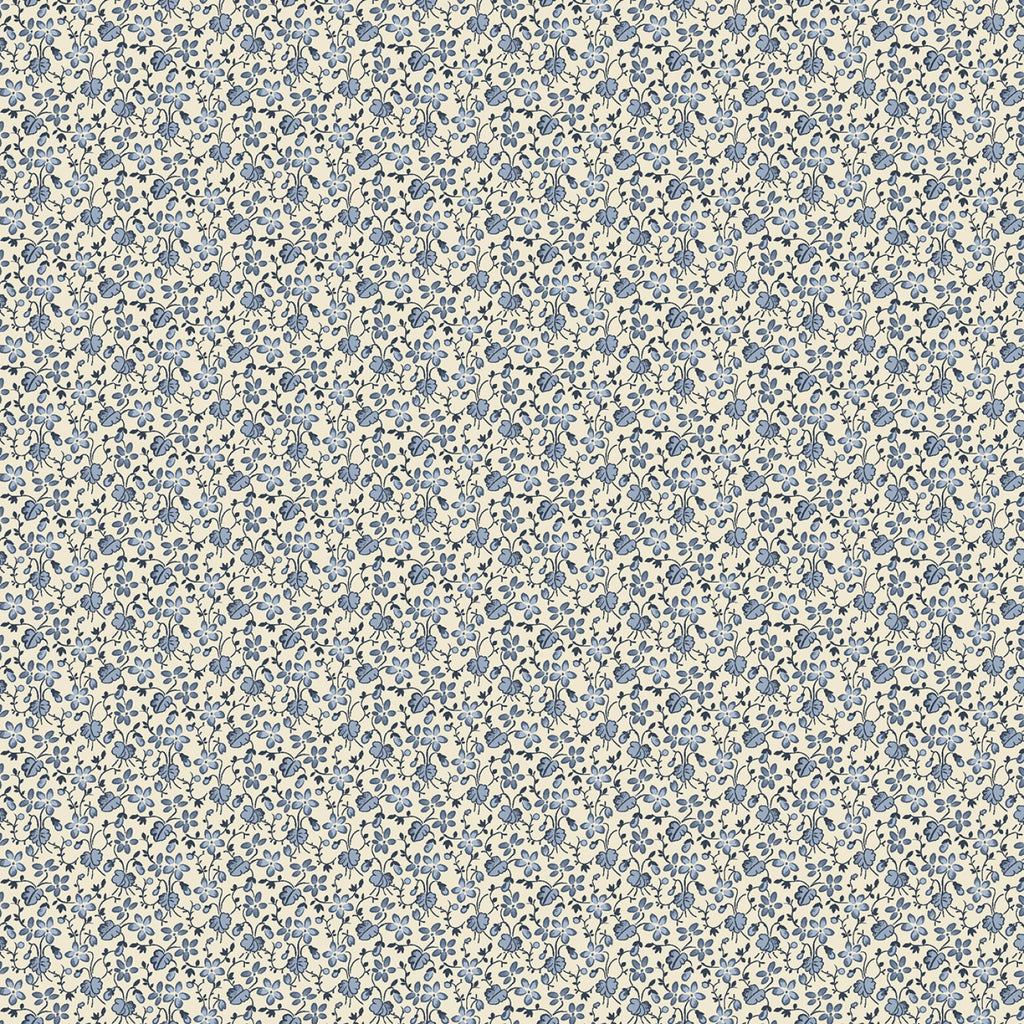 This fabric features a delicate pattern of petite blue flowers scattered across a soft, neutral background, creating a timeless and elegant design perfect for quilting, crafting, or apparel. The subtle floral print adds a touch of vintage charm, making it versatile for various creative projects.