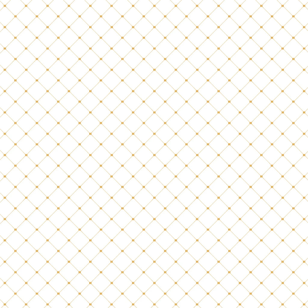 This fabric features a sophisticated design with a white background adorned with a delicate pattern of interlocking diamonds, each outlined with a fine metallic ink in a warm golden hue. The pattern creates a subtle yet elegant texture that is perfect for adding a touch of luxury to various sewing projects, from high-end fashion garments to exquisite home decor items. The fabric's crisp white base provides a versatile canvas, allowing the golden diamonds to stand out, offering a classic yet contemporary look