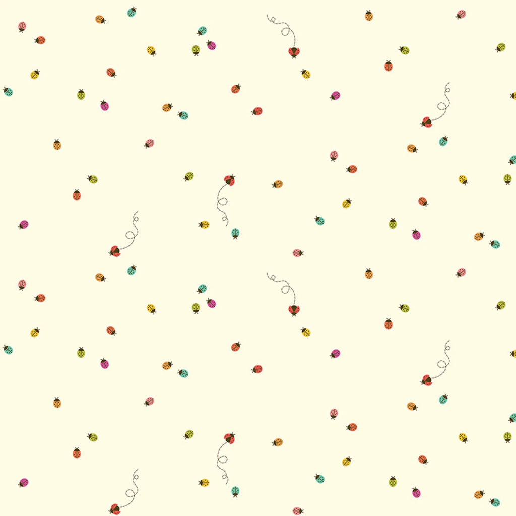 This charming fabric features a delightful pattern of colorful ladybugs scattered across a soft cream background, each with whimsical curly antennae. The design is playful and perfect for adding a touch of nature's whimsy to various sewing projects, from children's clothing to home decor items. This fabric's light and airy feel, combined with its adorable motif, makes it a versatile choice for creative endeavors.