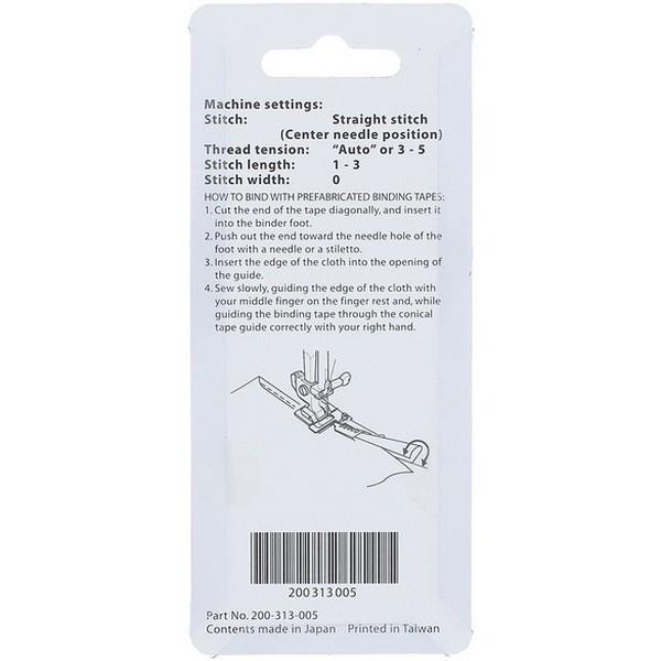 The binder foot is used to apply pre-folded bias binding tape or bias tape you have cut yourself to the edge of fabric in one easy step. It is equipped with a small funnel to fold and guide the binding over the fabric edge before it reaches the needle and can be used with either zigzag or decorative stitches as well as straight stitch. 10 mm to 14 mm bias tape can be used.