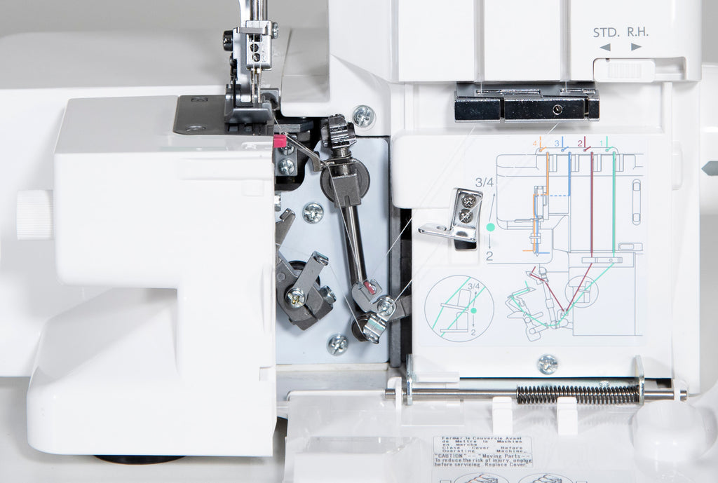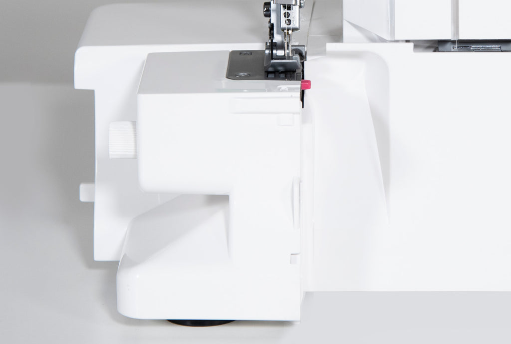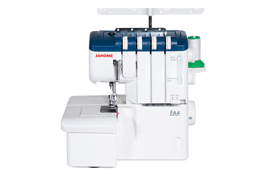 The FA4 with electronic foot control is an advanced overlocker with 2 needles and 2, 3, or 4 thread overlock stitching. The differential feed ratio, which is adjustable from 0.5 to 2.25 provides exceptional control for handling all types of fabrics and for creating desired special effects. Color-coded thread guides help with machine threading. The guide is automatically returned to its normal position when you turn the balance wheel. The thread tension automatically releases when you lift the presser foot so you can draw through the threads smoothly. The FA4 also lets you quickly switch to rolled hemming without changing the needle plate. A lower looper pre-tension stitch eliminates the need to change tension for rolled hems.
