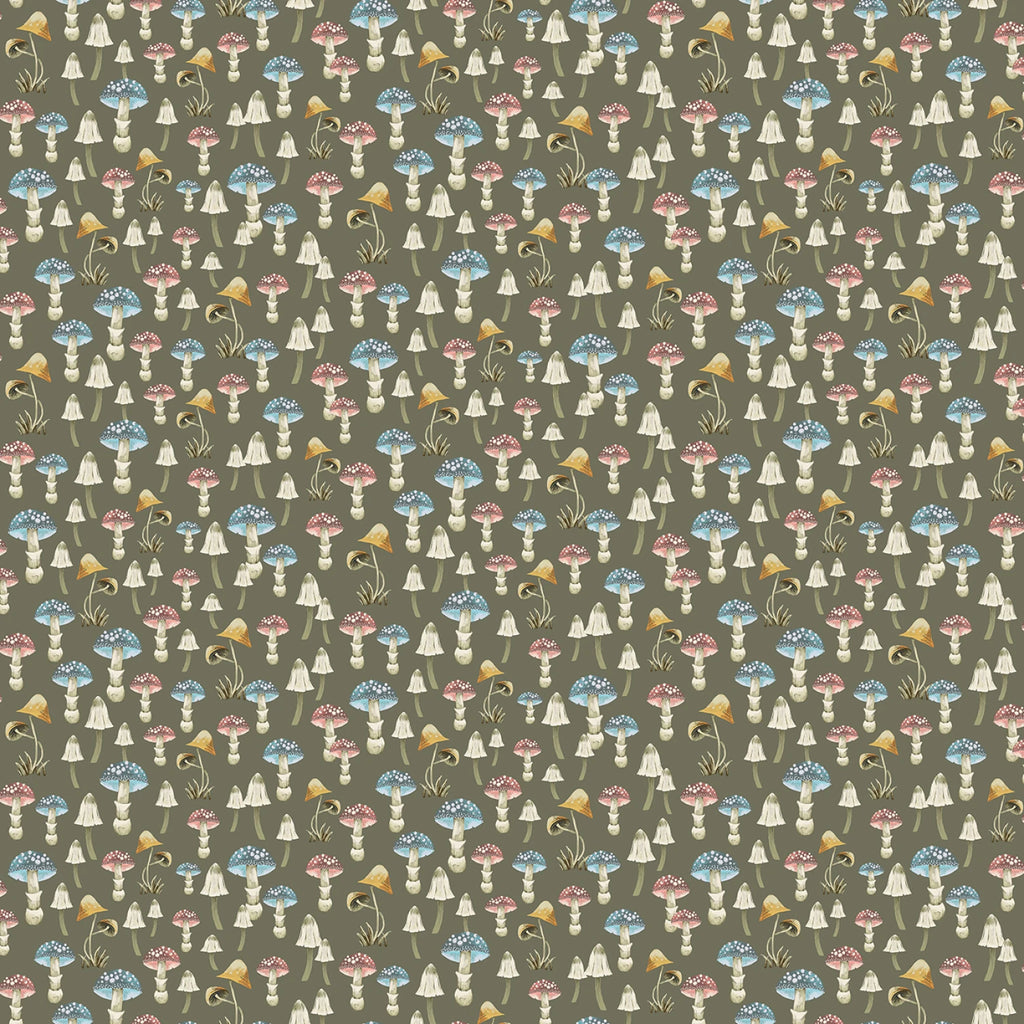This enchanting fabric features a delightful field of mushrooms in various shapes and sizes, scattered across a muted green background. The design showcases a whimsical array of mushrooms in shades of blue, pink, yellow, and white, creating a playful yet natural scene that is perfect for crafting projects that require a touch of nature's charm. The fabric's 100% cotton composition ensures comfort and durability, making it ideal for a variety of applications from apparel to home decor.