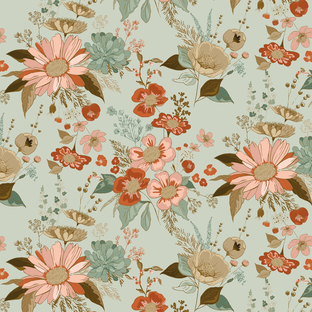 This fabric features a delightful floral pattern with a mix of large and small flowers in shades of pink, orange, and red, set against a soft mint green background. The design includes detailed illustrations of various blooms and leaves, creating a harmonious and charming aesthetic that's perfect for a variety of crafting projects, from quilting to apparel. The fabric's composition ensures comfort and durability, making it suitable for both home decor and fashion applications.
