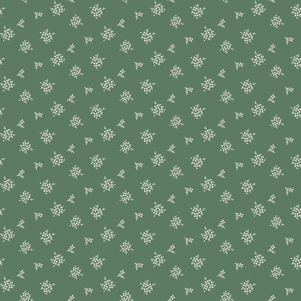 This fabric features a charming ditsy print of small white flowers scattered across a rich green background, evoking a fresh and serene morning ambiance. The design is simple yet elegant, making it ideal for a variety of sewing projects, from quilting to apparel, adding a touch of nature-inspired beauty to any creation.