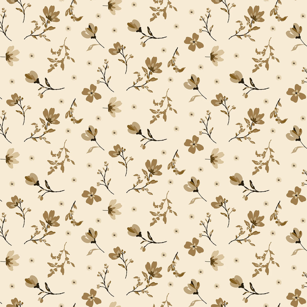 This fabric features a charming design with delicate floral motifs in shades of brown and beige, set against a soft cream background. The pattern consists of small flowers and leaves, creating a subtle yet elegant look that is perfect for a variety of sewing projects. The floral elements are evenly distributed, offering a balanced and harmonious aesthetic that can complement both traditional and contemporary styles.
