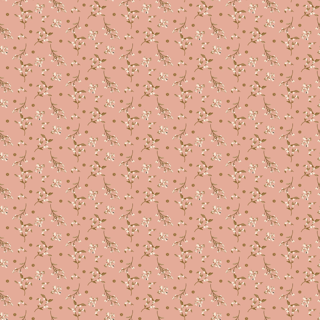This charming fabric features a delicate design of small floral sprigs and tiny polka dots scattered across a soft pink background, evoking a sense of vintage elegance. The pattern's subtle yet intricate details make it perfect for a variety of crafting projects, from quilting to apparel, adding a touch of nostalgic charm to any creation.