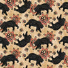 This fabric features a playful design with tan tossed bears, each depicted with claws, set against a background adorned with red and black circular motifs and scattered bear paw prints. The bears are illustrated in various playful poses, adding a dynamic and whimsical touch to the fabric. The design is perfect for creating unique projects that stand out with its charming bear theme.
