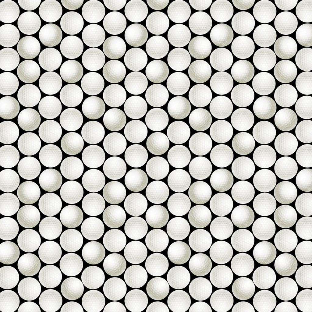 This fabric showcases a unique and playful design featuring a pattern of golf balls, each meticulously detailed to capture the texture and dimples of a real golf ball, set against a contrasting black background. The design is perfect for creating novelty items, sports-themed projects, or adding a touch of whimsy to any fabric project. The fabric's high-quality cotton material ensures durability and comfort, making it suitable for a wide range of applications from apparel to home decor.