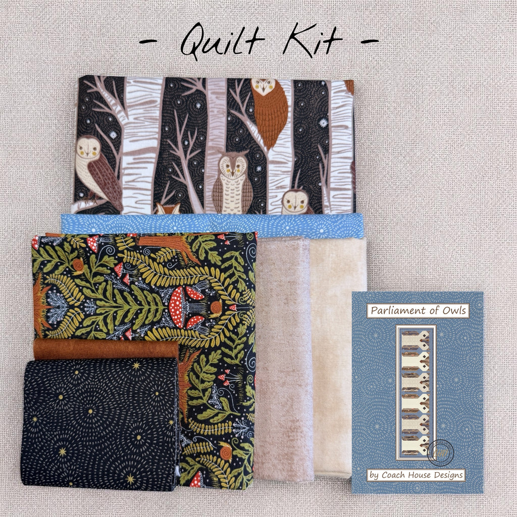 79" x 20" owl table runner featuring Gingiber's Night Owl Fabric line. The all pieced owls will keep watch over your table. Can also be used as a bed runner.