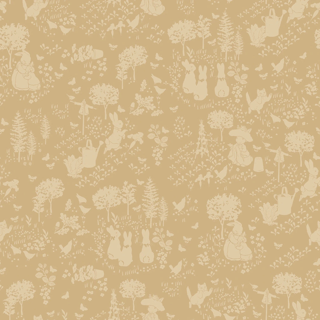 This charming fabric features a tonal garden design with silhouettes of Peter Rabbit and Benjamin Bunny amidst trees, flowers, and other woodland creatures. The soft tan background provides a subtle yet elegant backdrop, making it perfect for crafting projects that require a gentle, classic touch. Ideal for both B2B and B2C customers looking to add a touch of whimsy to their creations.
