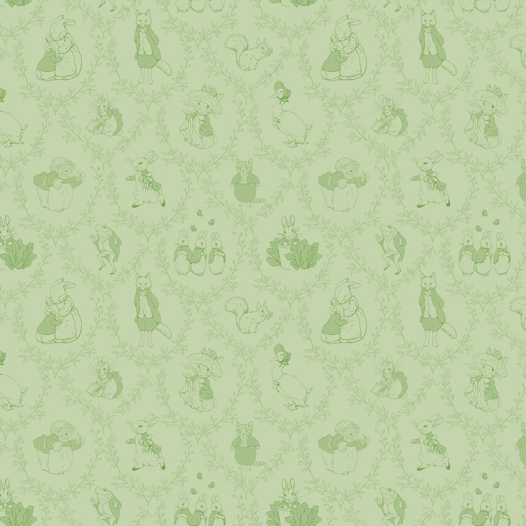 This charming fabric features a delightful toile print of Peter Rabbit and his friends, set against a soft fern green background. The design captures the whimsical essence of Beatrix Potter's beloved characters in various playful poses, framed by delicate laurel wreaths and scattered with small floral elements. Perfect for crafting projects that require a touch of nostalgia and charm, this fabric is ideal for creating children's clothing, cozy quilts, or unique home decor items.