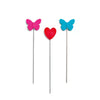 These flat head pins are decorated with butterflies and hearts in assorted pink, turquoise and red. 50pc included.