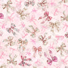 This fabric features a delicate and charming design, showcasing an array of pink and blush-colored bows with floral accents scattered across a soft pink background. The pattern is whimsical and romantic, perfect for crafting projects that require a touch of elegance, such as dresses, accessories, or home decor items. The bows vary in size and orientation, creating a dynamic and playful visual effect that appeals to both traditional and contemporary tastes.
