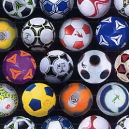 This vibrant fabric showcases an array of soccer balls in various colours and designs, including traditional black and white patterns as well as more modern and artistic interpretations. The soccer balls are arranged in a grid pattern, creating a dynamic and energetic visual appeal perfect for sports enthusiasts or anyone looking to add a playful touch to their projects. The fabric is ideal for creating items like sports-themed apparel, bags, or home decor, offering a unique blend of functionality and fun.