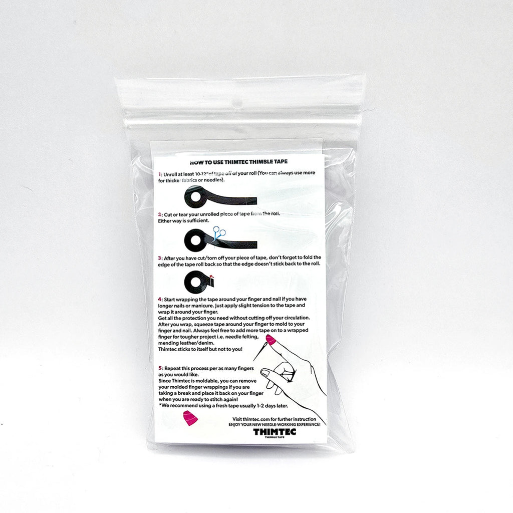 Experience the ultimate in hand protection with Thimtec Thimble Tape in White Cloud. This innovative tape is designed to prevent hand fatigue, allowing you to stitch through light to heavy layers with ease. It's puncture resistant, providing excellent grip strength while molding perfectly to your finger and nail. The tape sticks to itself, not to you, ensuring a comfortable fit that's heat resistant and latex-free. Customizable for your needs, simply tear or cut off 8-10 inches or more, wrap tightly around your finger, and squeeze to mold for a snug fit. Reusable until it wears down, this tape is ideal for sewing, quilting, mending, crafting, sashiko, knitting, crochet, needlepoint, and all fiber arts. The packaging highlights its puncture resistance, comfort, and protective qualities, with clear instructions on how to apply it for optimal use.