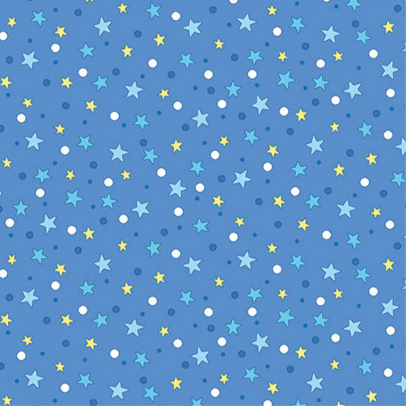 This delightful fabric includes Shades of Blue and yellow stars and dots on a light blue background.