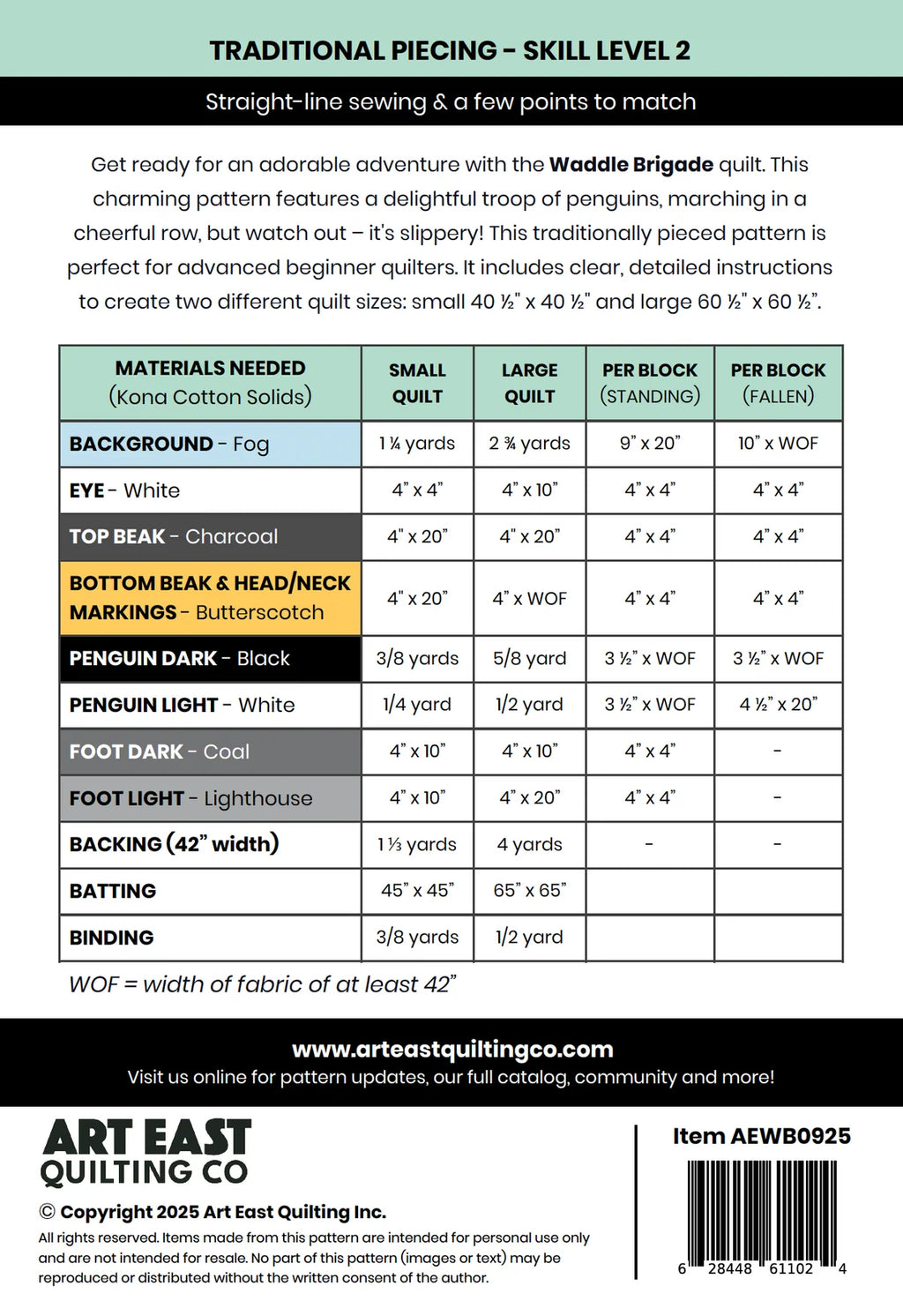 Get ready for an adorable adventure with the Waddle Brigade Quilt. This charming pattern features a delightful troop of penguins, marching in a cheerful row, but watch out – it's slippery! This traditionally pieced pattern is perfect for advanced beginner quilters.
