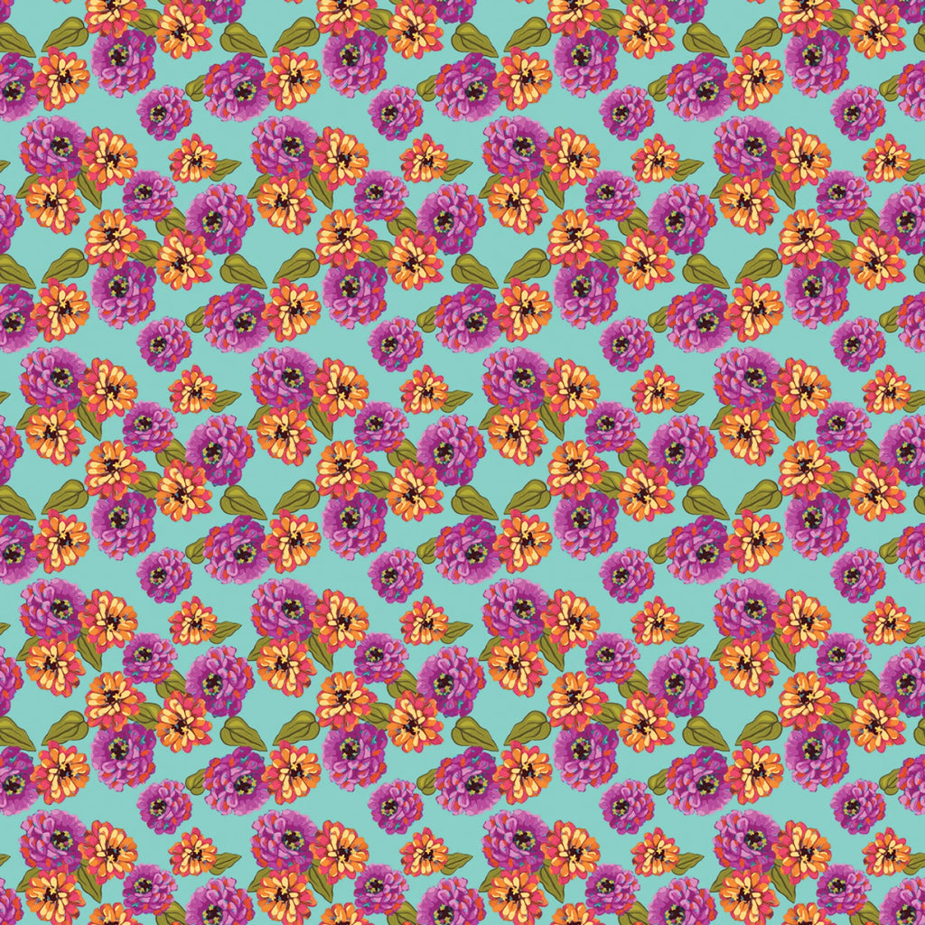 This vibrant fabric features a delightful pattern of zinnias in shades of purple, orange, and pink, set against a refreshing aqua background. The design is playful and lively, with clusters of flowers and leaves scattered evenly across the fabric, making it ideal for a variety of crafting and sewing projects. The fabric's bright and cheerful aesthetic brings a touch of garden freshness to any creation, whether it's for fashion, home decor, or quilting.